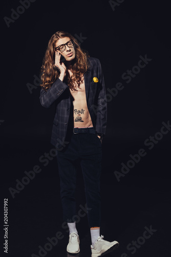 person, people, model, caucasian, male, man, european, connection, style, fashion, elegant, stylish, communication, talk, wireless, shirtless, using, trendy, vogue, alone, eyeglass, goggles, photogenic, contraption, torso, fashionable, smartphone, modelling, masculine, styling, tattooed, tattoo, long hair, studio shot, young adult
