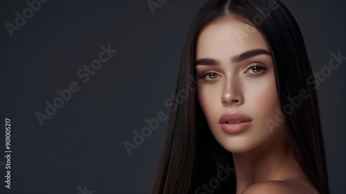 Fashionable young model woman with long healthy dark straight smooth hair and makeup studio beauty portrait : Generative AI