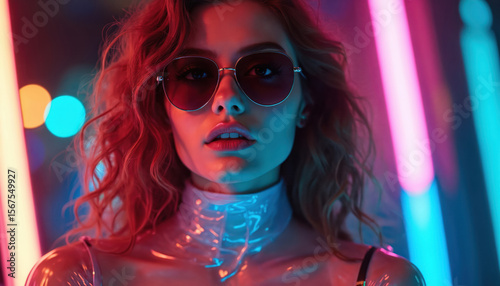 Fashionable young woman wears shiny plastic top, sunglasses, illuminated by neon fluorescent lights. Bokeh background creates vibrant atmosphere perfect for music, disco, clubbing events. Plenty of