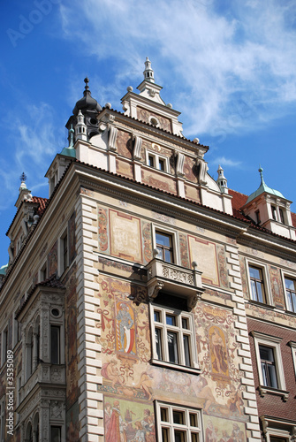 veneer, house, prague, czech republic, architecture, view, dormer, balcony, bay window, painting, baroque, aged, heaven, cloud