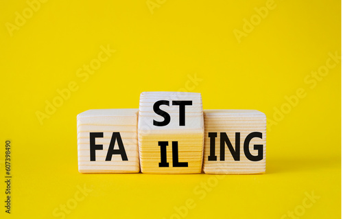 Fasting vs Failing symbol. Wooden cubes with words Failing and Fasting. Beautiful yellow background. Fasting vs Failing and business concept. Copy space
