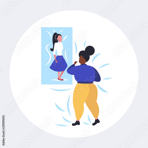 fat obese african american woman looking at thin sexy girl on picture overweight lady weight loss motivation obesity concept flat full length