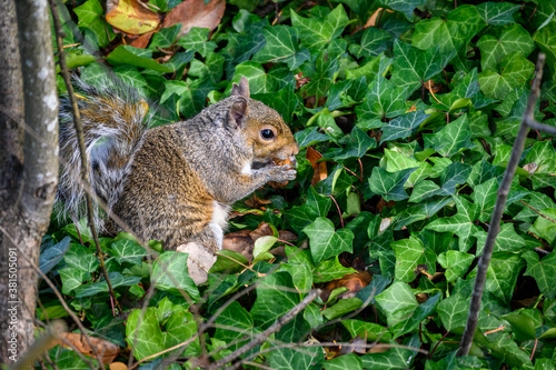 Fat squirrel feeding on a pinecone on an ivy-covered forest floor