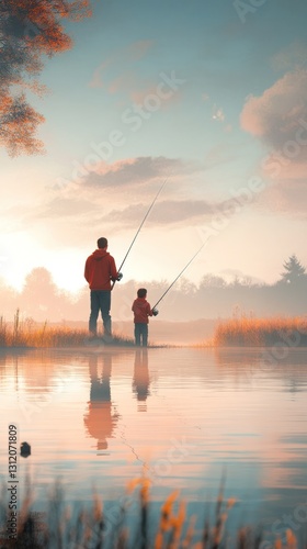Father and child enjoy fishing together at a quiet lake on Father Day. Vertical.