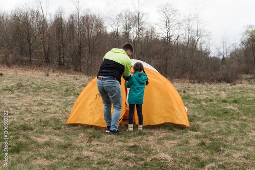tent, father, daughter, camping, meadow, nature, family, bonding, adventure, green, orange, peaceful, cloud, landscape, grass, activity, learning, childhood, togetherness, fun, exploration, fatherhood, parenting, recreation, fresh air, happiness, teamwork, enjoyment, wilderness, calmness, moment, sunshine, companionship, leisure, skill, growth, environment, playfulness, scenery, summer, children, tent, memory, outdoor recreation