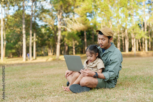 Father and daughter sitting on grass using laptop together in national park. Father teaching daughter in outdoor setting, creating a peaceful learning moment in a nature-filled environment.