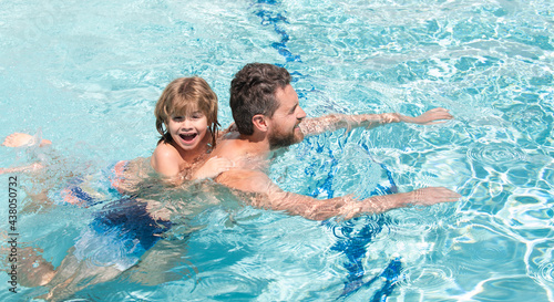 Father and son swimming in pool, summer family. Swimming lessons. Summer vacation. Father and son leisure. Fathers Day.