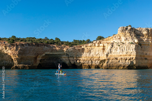 algarve, atlantic, atlantic ocean, europa, portugal, sup, beach, board, brown, children, cliff, cloudless, coast, coastal, daughter, enjoy, family, father, fun, glimmer, landscape, lifestyle, nature, ocean, orange, outdoors, paddle, eltern, red, reflect, rocky, sand, sky, son, sport, sunny, surfboard, vacation