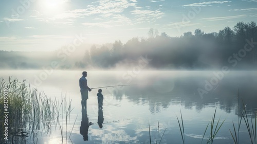 Father and young son fishing together in a misty lakeside setting at dawn, sharing a peaceful moment.