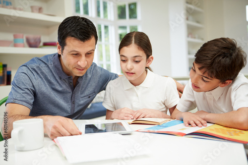 Father Helping Children With Homework Using Digital Tablet
