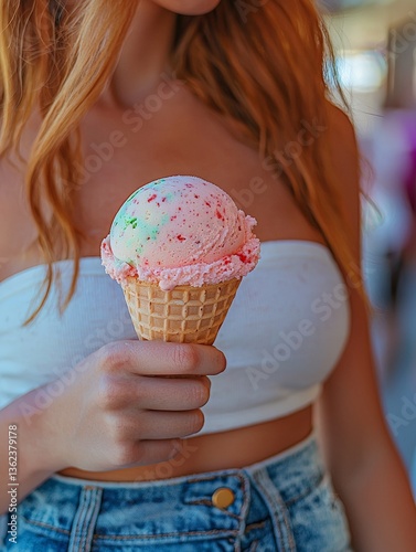 Father holding daughter while eating ice cream cone in natural light captured at outdoor summer location showcasing family dessert bonding and joyful snack vibe