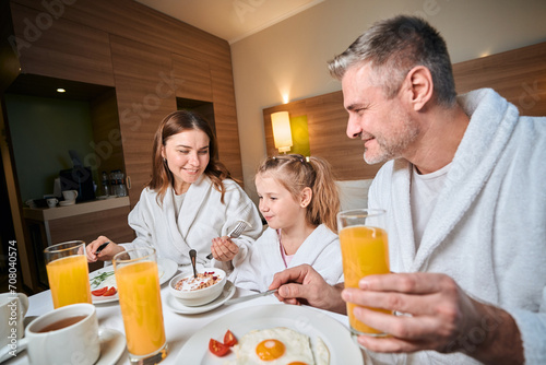 hotel, travel, vacation, resort, tour tourism, room, accommodation, bedchamber, lifestyle, food, comfortable, table, breakfast, bed, trip, woman, light, journey, lighting, adult, drink, bathrobe, caucasian, european, man, family, plate, delicious, children, hot drink, children, juice, tasty, egg, eat, father, eating, mother, flake, smiling, daughter, smile, little girl, croissant, cup, goggles, fresh, cocoa, feeding
