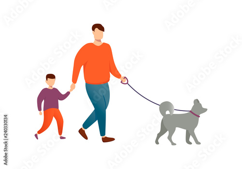 father, family, son, boy, vector, illustration, isolated, white, man, little, small, walk, walking, clothes, autumn, fall, september, october, yellow, colours, colours, colourful, orange, sweeter, pant, trousers, character, flat, style, male, person, people, warm, race, european, decoration, happy, together, young, children, lifestyle, background, children, fun, happiness, eltern, love, dog, husky, leash