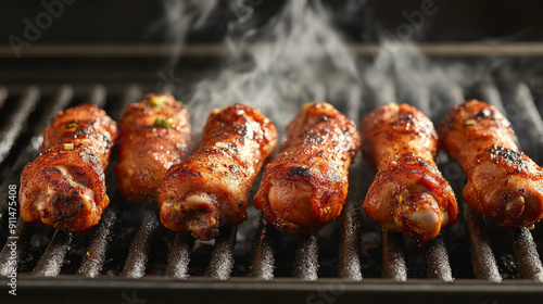 Feast your eyes on mouthwatering, crispy seasoned chicken drumsticks sizzling on a grill. The billowing smoke adds an irresistible touch of drama and depth, making it an irresistible sight.
