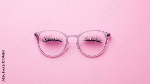 featuring pink eyeglasses with long black eyelashes resting inside the lenses. Set against the same pink background, the visual retains its playful and feminine charm. The transparent pink glasses add