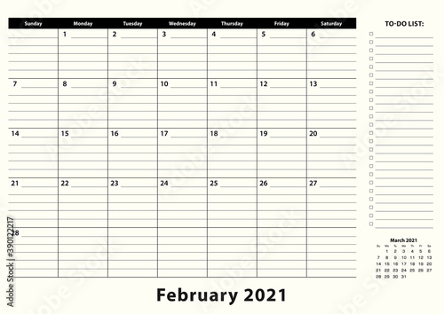 february, calendar, desk, pad, to do, list, note, date, day, month, week, planner, organiser, template, illustration, modern, design, event, vector, graphic, simple, sunday, number, page, year, holiday, monday, schedule, office, diary, monthly