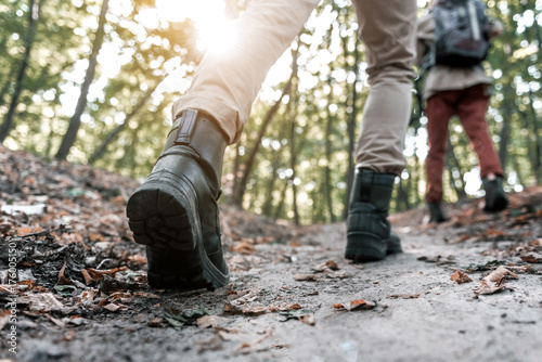 Feet of young couple hiking in the woods