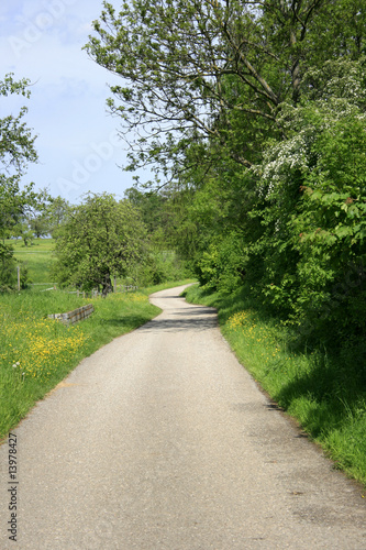 country road, spring, colourful, curve, yellow, green, meadow, taraxacum, bench, field, grass, apple tree, way, horizon, blue skies, cloud, end, countryside, flowered, tree, tree, shrub, street, heaven, blue, sun, awake, cloud, sitting, rest, waiting, ease, asphalt, curvy