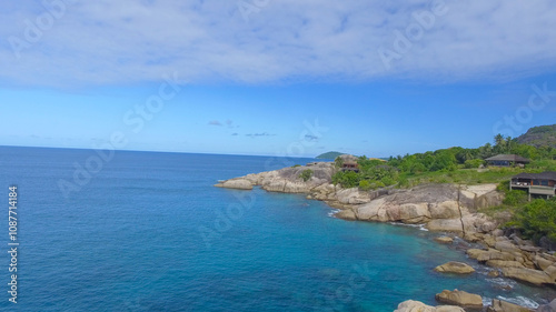 Felicite Island, close to La Digue, Seychelles. Aerial view of tropical coastline on a sunny day