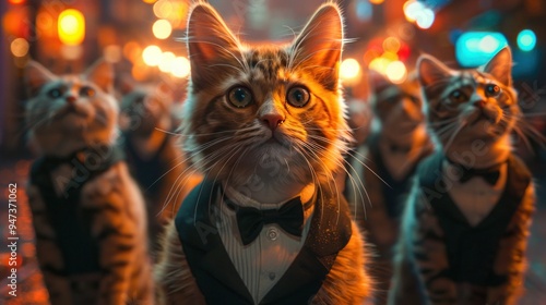 Feline Party: Colorful Cats Dancing in Tuxedos on Vibrant Nightlife Stage