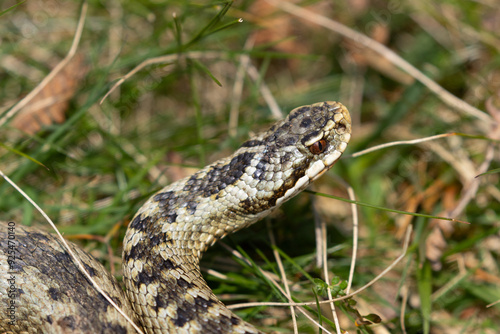 Female Adder crawling through grass, Weardale, County Durham, England, UK.