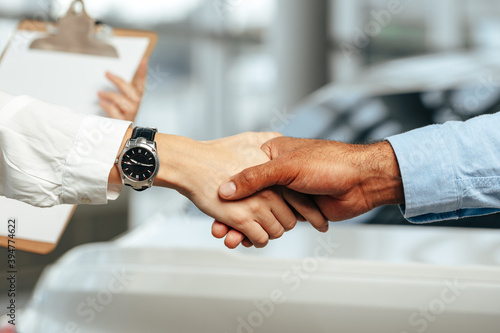 Female and male businesspeople handshake close up