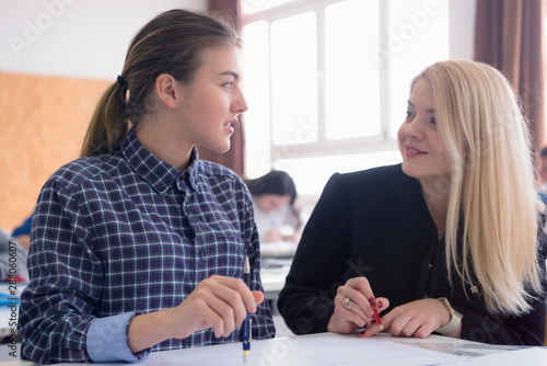 Female Architecture teacher at work. Female professor explain architectural projects to students. Beautiful female university architecture professor explain lessons to multiethnic students.