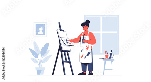 artist, easel, painting, studio, woman, canvas, apron, creative, art, workplace, painter, artistic, brush, design, hobby, indoor, person, craft, occupation, interior, creation, lifestyle, workspace, liquid, drink, refreshment, plant, picture, artwork, modern, drawing, vignetting, illustration, window, inspiration, indoor, contemporary, visual, expression