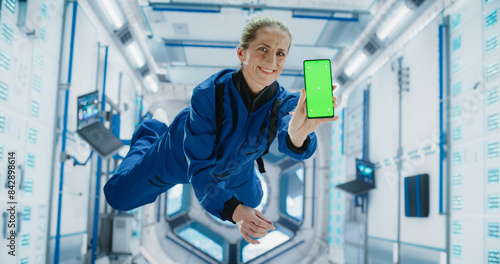 Female Astronaut Floating Inside Space Station in Zero Gravity. Spacewoman Showing a Smartphone with Green Screen Mock Up Template. Woman Posing for Camera, Smiling in a Room in a Spacecraft