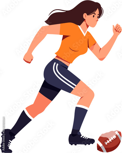 football, running, athlete, sportswoman, activewear, game, competition, player, action, active, speed, fitness, training, exercise, determination, sharpened, strength, skill, woman, energy, movement, practice, race, field, goal, kickoff, defense, offence, tackle, catch, pass, score, victory, winning, championship, league, athletic, powerful, dynamic, swift, graceful, competitive, stamina, agility, endurance, dedicated, committed, focused