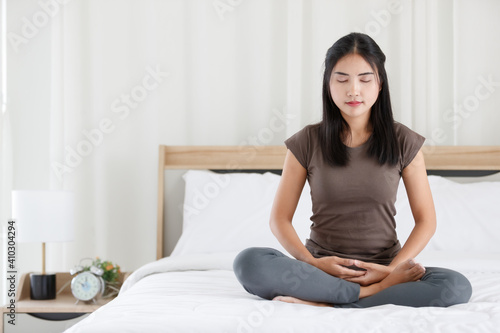 Female Buddhist sitting on bed in the bedroom and doing meditation in Buddhism religion style. The idea for faith and trust in religion and calm of mind
