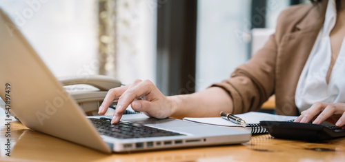 Female businessman working on desk office with using a calculator to calculate the numbers, finance accounting concept.