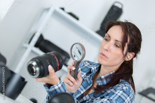 magnifying, technician, camera, female, photo, analysing, appliance, closeup, colours, day, exam, fixing, glasses, human, large, metal, object, 1, optical, optical, part, photo, photographer, photographic, service, technology, tool, guarantee, working, plaid, concentration, lens, detail, fractured