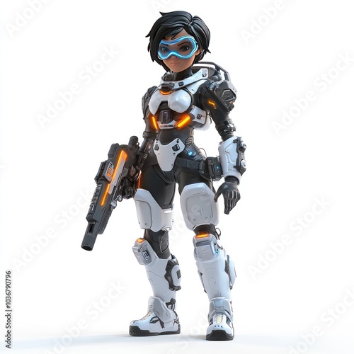 female, character, futuristic, combat, gear, holding, gun, soldier, warrior, armoring, cyborg, robot, science, fiction, space, weapon, helmet, goggles, visor, suit, boot, white, black, orange, blue, standing, pose, isolated, background, three-dimensional, render, illustration, artwork, art, design, graphic, digital, short hair, black hair, enemy, destruction, modern, cyber, pattern, curve, war, creativity