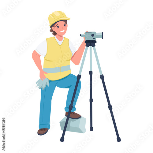 Female construction worker with video camera semi flat color vector character. Full body person on white. Gender equality simple cartoon style illustration for web graphic design and animation