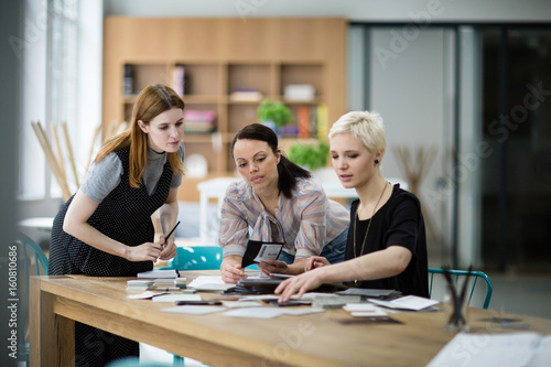 business, office, team, group, co-worker, designer, architect, teamwork, creative, working, meeting, discussing, idea, project, planning, looking, choosing, agreements, female, only, woman, businesswoman, startup, modern, workplace, communication, multiracial, casual attire, standing, sitting, talking, paperwork, swatch, sample, caucasian, african american, black, mixed race, young, adult, 20s, 30s