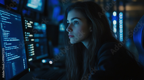 Female cyber security analyst analysing AI cyberspace threats on computer in dark tech office data centre. Blue lighting. IT specialist ethical hacking