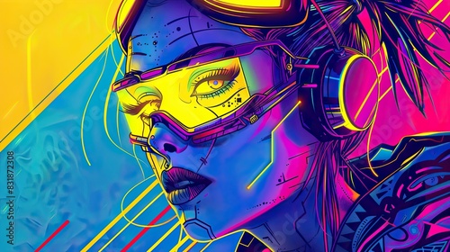 Female cyborg with goggles and headphones in neon colors. Digital art illustration with vibrant blue, yellow, and pink background. Futuristic and cyberpunk concept for design and print. Close-up view.