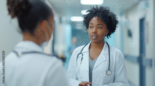 female, doctor, african, american, hospital, corridor, consulting, patient, ai, generated, medicals, woman, person, house, man, office, african american, profession, medicine, practitioner, white coat, professional, specialist, talking, healer, smiling, happy, healthy, consult, black, health, clinic