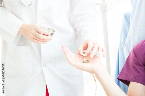 Female doctor gives a drug to the patient in a bed.
