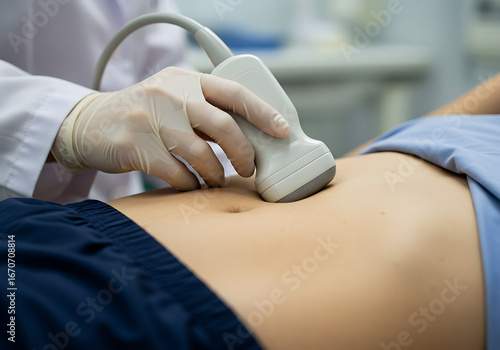 Female doctor operating ultrasound scanner on patient's abdomen for medical diagnosis