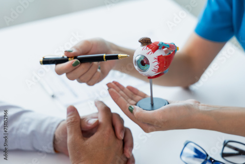 Female doctor talking with patient in clinic room at table Focusing on eye health with male patients. and use eye models and eyeglasses to discuss vision health.