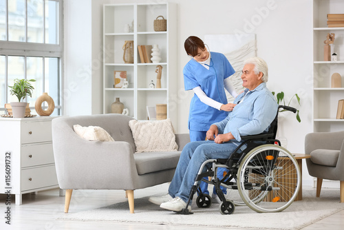 Female doctor with stethoscope listening to mature man in wheelchair at home