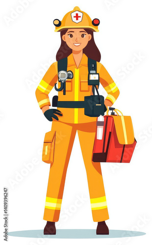 cute, sticker, medicals, responder, emergency, first aid, firefighter, paramedic, health care, woman, professional, equipment, supply, safety, protection, uniform, gear, protective, clothing, harness, tool, bag, red, orange, yellow, human, person, cartoon, illustration, character, design, figure, standing, positive, confident, ready, prepared, support, service, assistance, care, aid, health, community