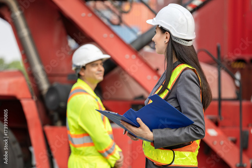 worksite, standing, warehouse, container, commercial, import, harbor, commerce, shipping, cargo, dock, international, export, delivery, transport, transportation, logistic, port, loading, freight, box, terminal, stack, industry, helmet, engineer, men at work, safety, construction, work, engineering, equipment, woman, building, industrial, occupation, people, business, site, technology, foreman, person, professional, project, architect, female, control, hard hat