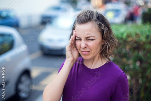 Female feeling headache on the street. Stressed woman