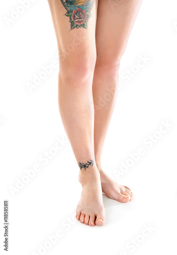 Female feet with tattoo, isolated on white