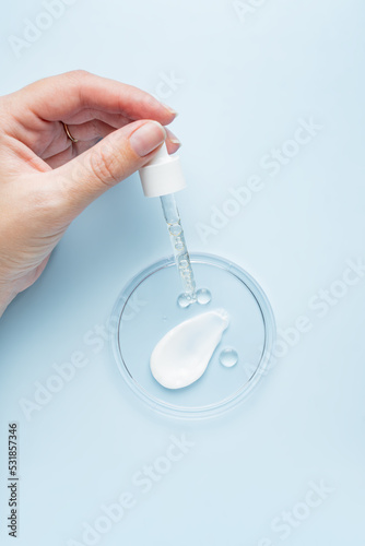 Female hand holding a pipette dropper with face serum or peeling over petri dish with samples of cream and oil. Organic cosmetics. Top view flat lay, copy space. Cosmetics, SPA branding, mock-up.