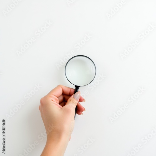 Female hand holds magnifying glass over white background, focus on glass and hand, minimal and modern, square shot.