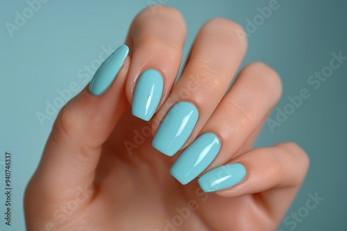 Female hand with blue nail polish manicure on blue background. 3D